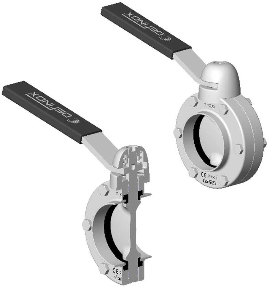 Butterfly-ventilen fra Definox er udført i et yderst hygiejnisk design med ny innovativ pakning. Det nye design har en fremragende levetid og kvaliteten af den nyeste generation af elastomerer har en forbedret kemiske resistens.