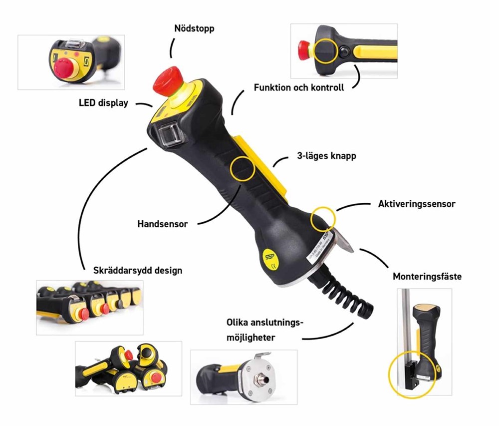 Det vigtigste ved betjeningsgrebet er de tre niveauer. Når trykknappen på grebet er trykket ind i en tydelig midterstilling, er visse farlige bevægelser tilladt. Skulle der ske noget uforudset, kan trykknappen trykkes i bund eller slippes, og derefter sendes et stopsignal til maskinen.