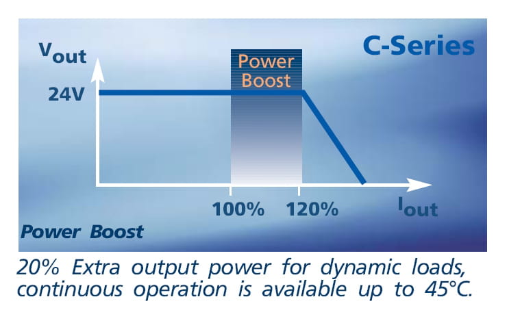 Dimension Q-serien er udstyret med en bonuseffekt, der gør det muligt at levere op til 150 % af den nominelle belastning i op til 4 sekunder. Denne ekstra kapacitet er tilgængelig i hele driftstemperaturområdet og kan udnyttes med det samme – både lige efter opstart og efter en kortslutning.