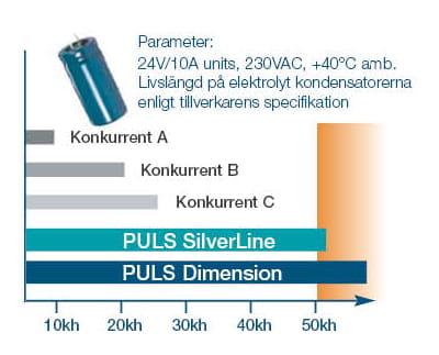 Elektrolytkondensatorerne er den mest varmefølsomme komponent og afgør levetiden. For hver 10 °C temperaturstigning halveres levetiden. Høj kvalitet på kondensatorerne sammen med høj virkningsgrad er en forudsætning for en god strømforsyning – og alle PULS’ strømforsyninger opfylder disse krav.